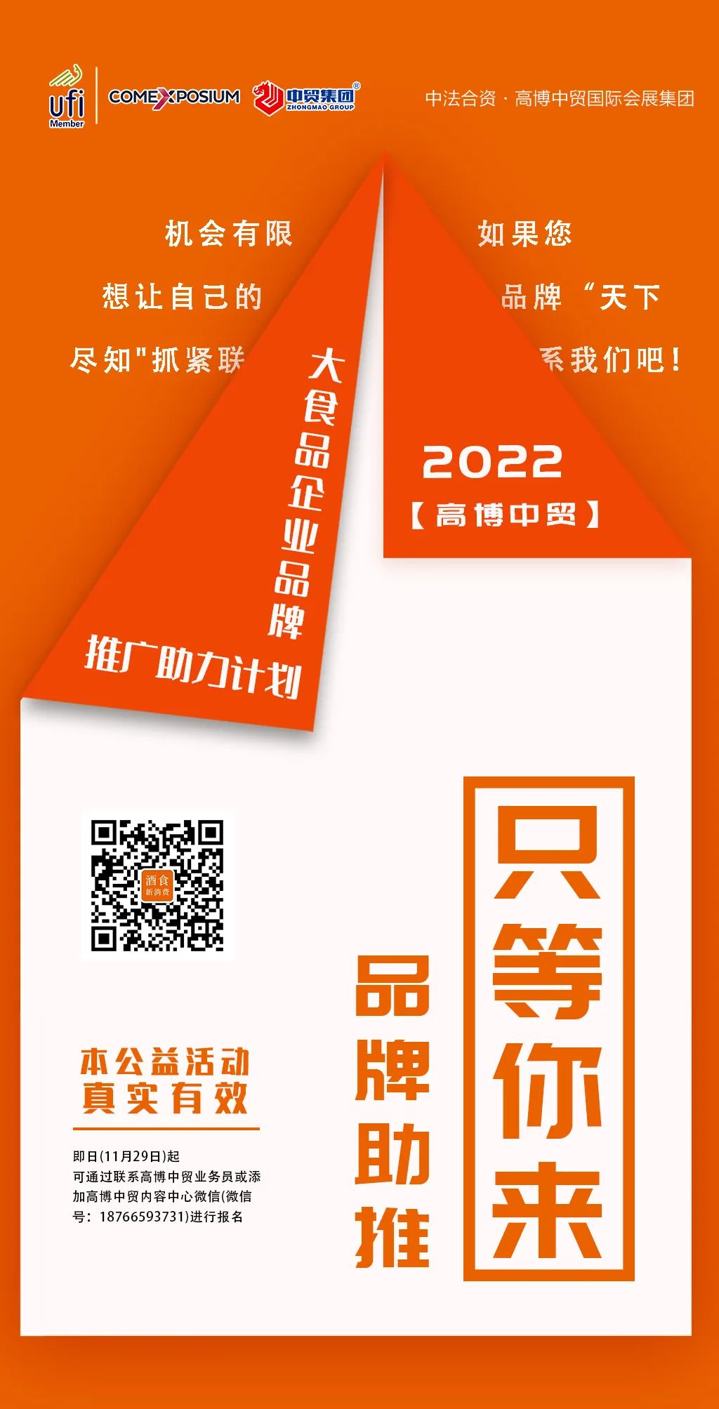 本公益活動真實有效,即日(11月29日)起,可通過聯系高博中貿業務員或添加高博中貿內容中心微信(微信號:18766593731)進行報名,我們將根據報名順序逐一與企業進行聯系,著手排期進行助力計劃。
